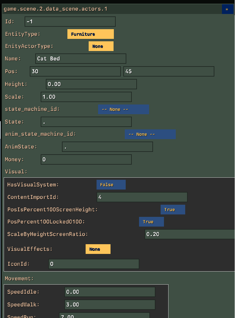 State gives us what this Entity is doing. Are they sitting idle, walking somewhere, in combat? Is this Entity an NPC, or the Player avatar, or a UI item, or the level itself, or a timer? Entities can be anything, whether they have content seen by the player or not.